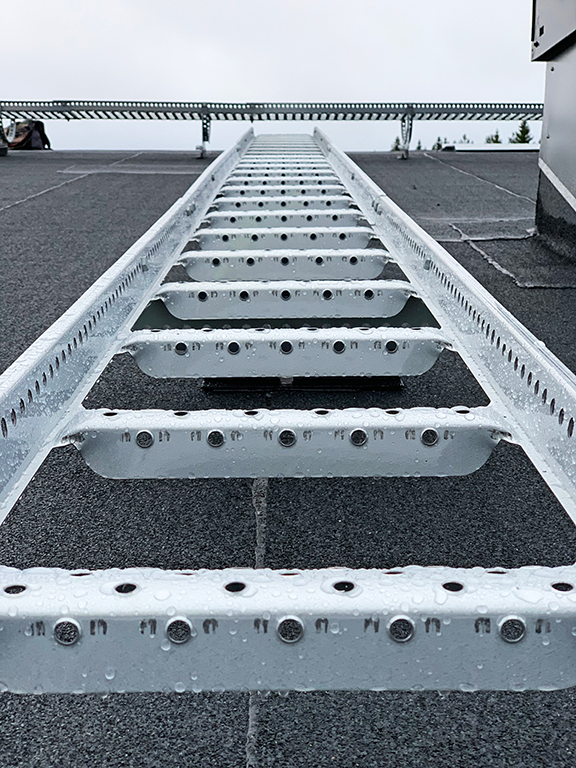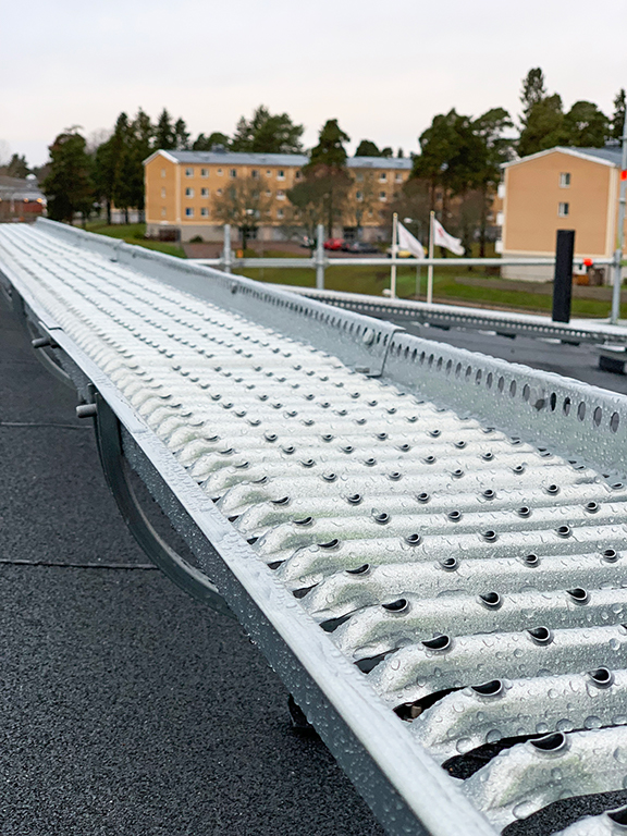 En gång- eller takbrygga krävs där du behöver förflytta dig. Den ska underlätta passage till serviceställen och du ska även kunna fästa din fallskyddsutrustning i den. För att ge bra grepp är ytan av ett grovt mönster och kanterna uppvika. En gångbrygga monteras horisontellt på taket medan en takbrygga eller takstege ska monteras längs med takets lutning.
